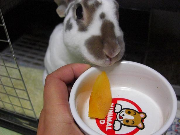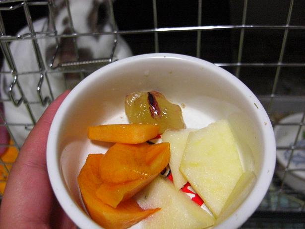 続いて柿、ブドウ、そして最後の一切れにリンゴが側面に張り付いていたのを必死に食いついて完食。