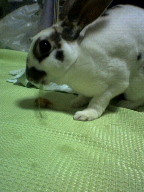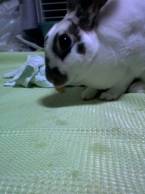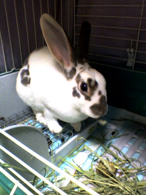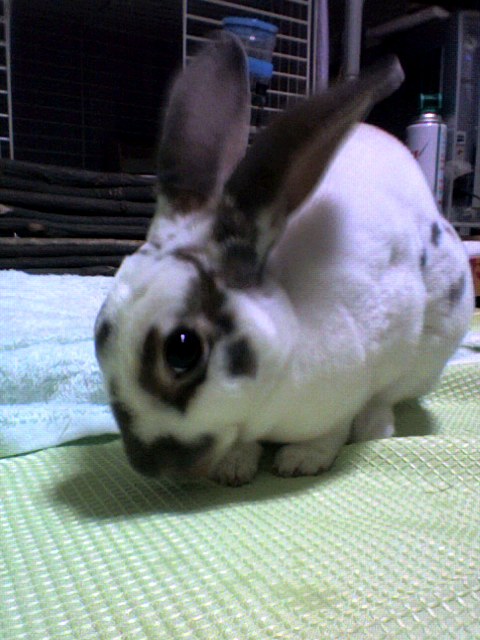 なんとかケージに入れて様子をみようと放置してやっと匂いを嗅いだり牧草の位置を確かめ、ペレットは即食い(笑)