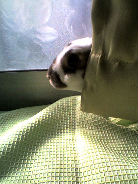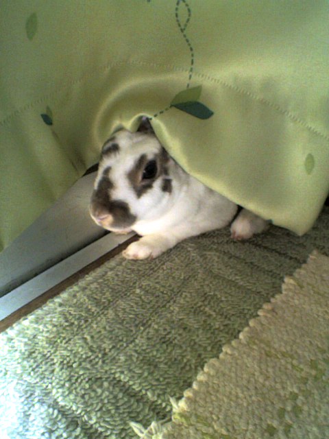 カーテン裏に逃げ込みます。